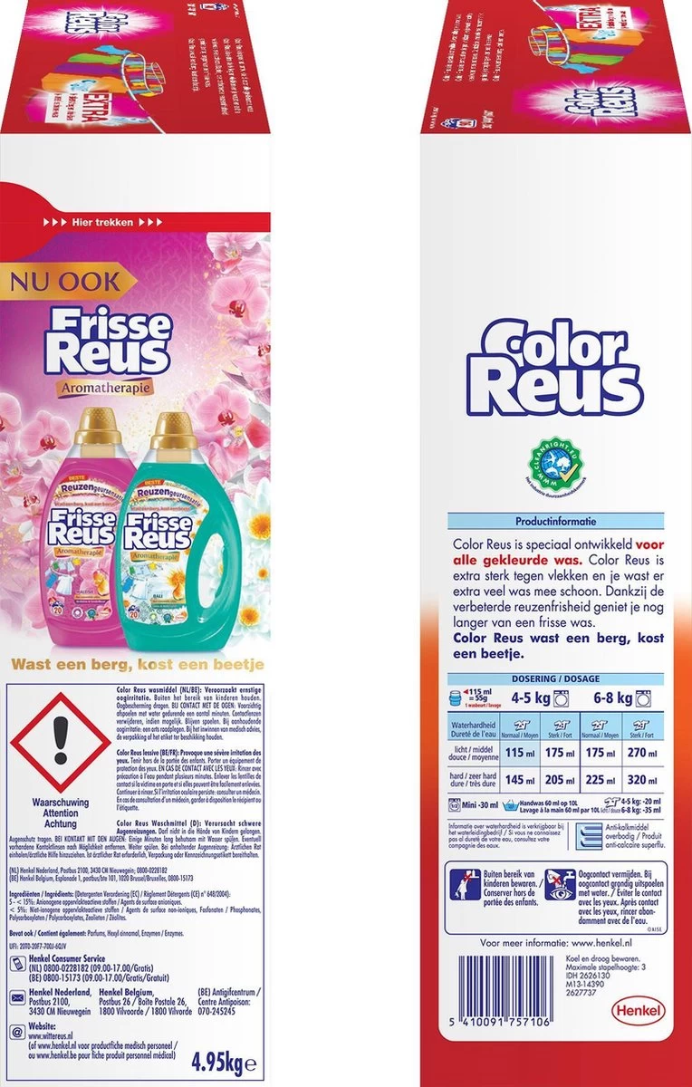 Color Reus is een waspoeder van Witte Reus speciaal ontwikkeld voor alle gekleurde was. De formule van Color Reus beschermt kleuren en laat ze langer stralen.
