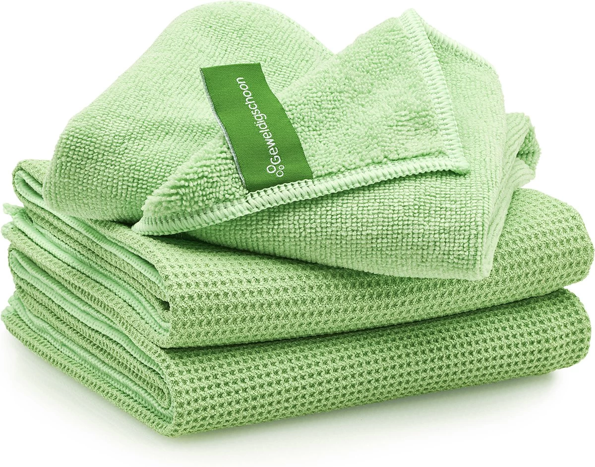 De hoogwaardige Geweldigschoon Raamdoekenset bestaat uit 3 speciaal geweven microvezeldoeken: de schoonmaakdoek in het handige 40 x 40 cm formaat en 2 x de bekende M-formaat droogdoek van 60 x 45 cm. Alle doeken zijn bijzonder slijtvast en staan bij correct gebruik garant voor jarenlang plezier.