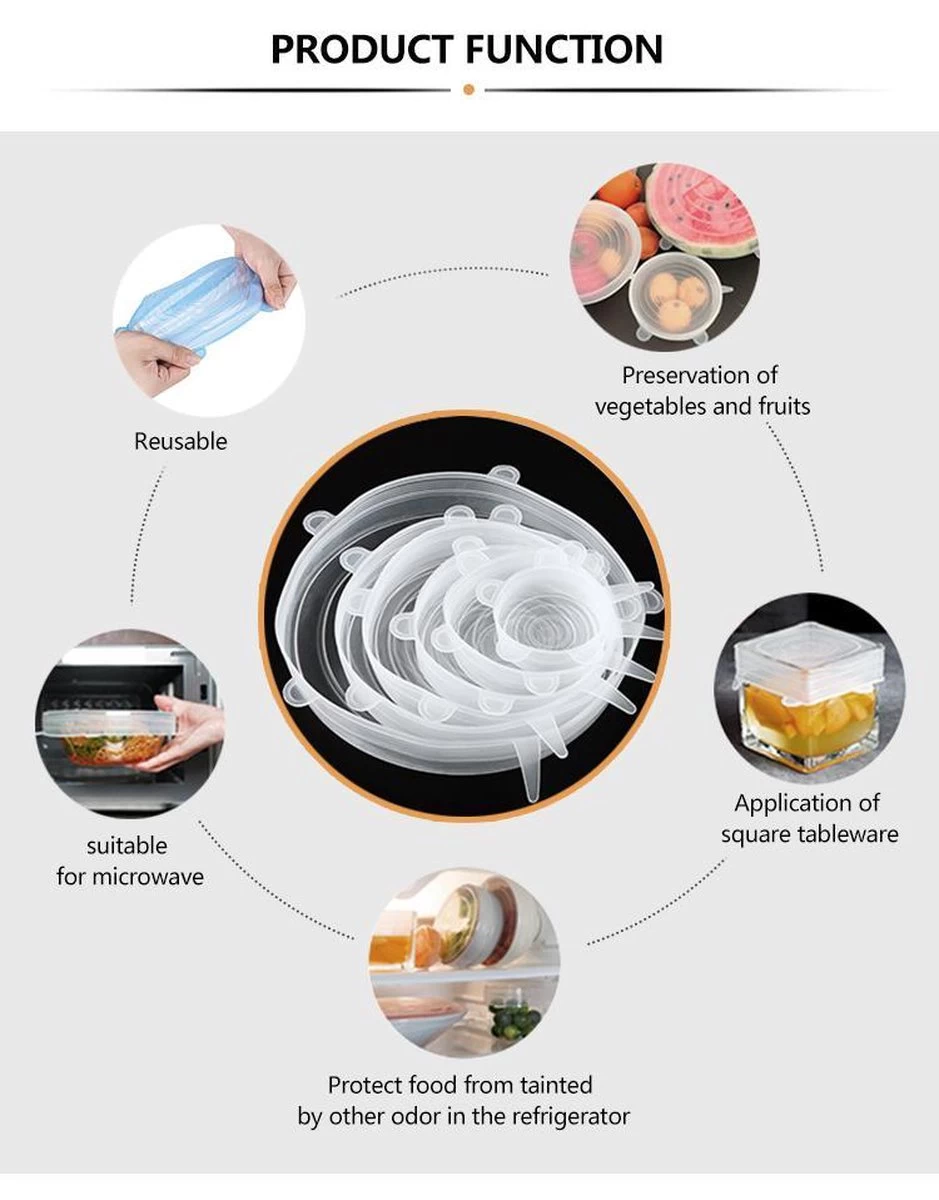 Deze siliconen deksels zijn tot wel 30% uitrekbaar! Hierdoor passen deze deksels niet alleen op een rond oppervlak maar zijn ze ook te gebruiken voor rechthoekige, ovale of vierkante vormen.